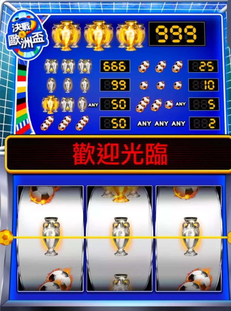 《決戰歐洲盃》採用1×3的老虎機設計,僅需三個轉輪即可快速判斷中獎結果,適合喜愛簡單玩法的玩家上手操作。而遊戲的關鍵特色在於其連線組合與倍數獎勵機制,讓玩家即使在簡單的轉輪設計中,也能享受高額彩金帶來的刺激感受。