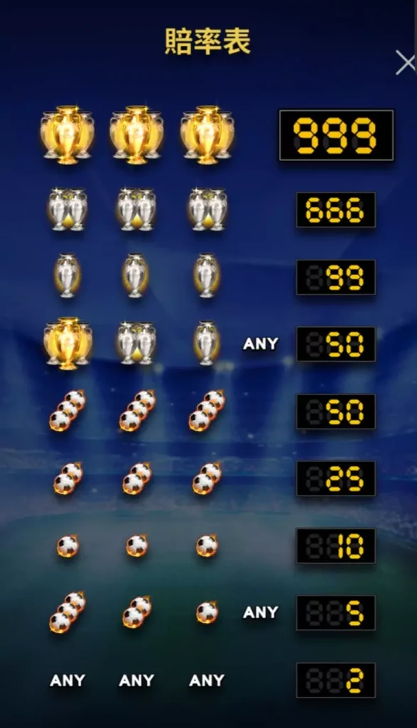 金獎盃是遊戲中的最高獎勵符號,當玩家在三個轉輪上同時獲得三個金獎盃時,即可直接贏取最高999倍彩金!這個設計讓玩家充滿期待,因為只需一瞬間的幸運,便有機會翻倍獲得巨額獎金,感受極致的快感與興奮。