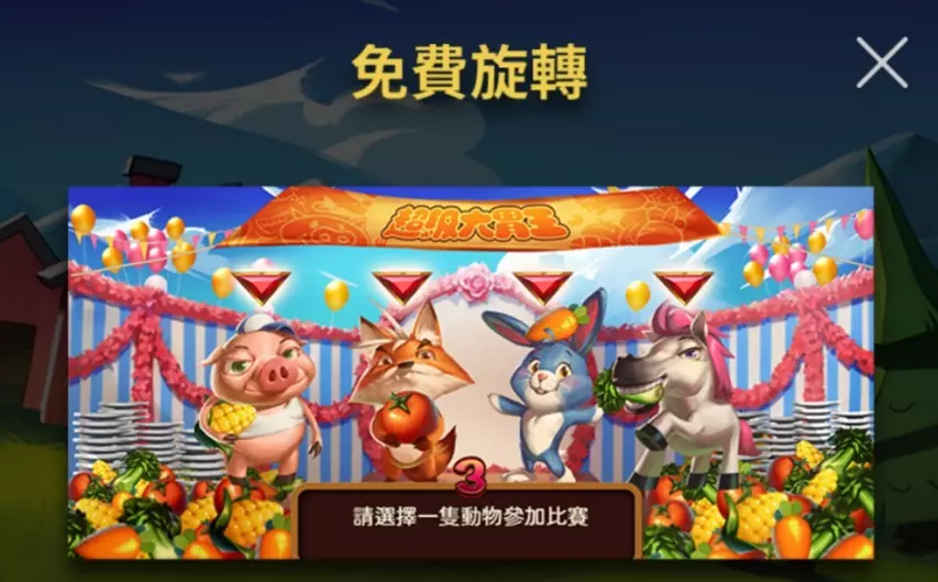 觸發免費旋轉模式後,玩家將進入一個獨特的競賽環節,需要選擇一隻動物角色參加比賽。