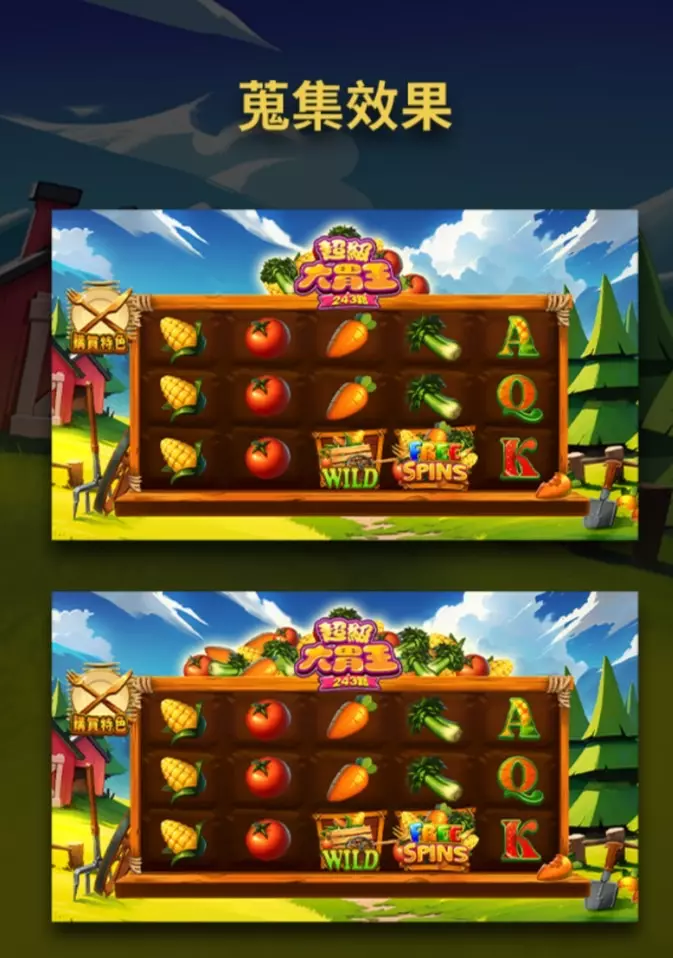 免費旋轉期間,盤面上出現的蔬菜不僅能推動角色比賽進度,還會蒐集到上方的「蔬菜山」中。當蔬菜山滿階時,玩家將獲得一次額外的免費旋轉機會,讓遊戲延續更多回合。