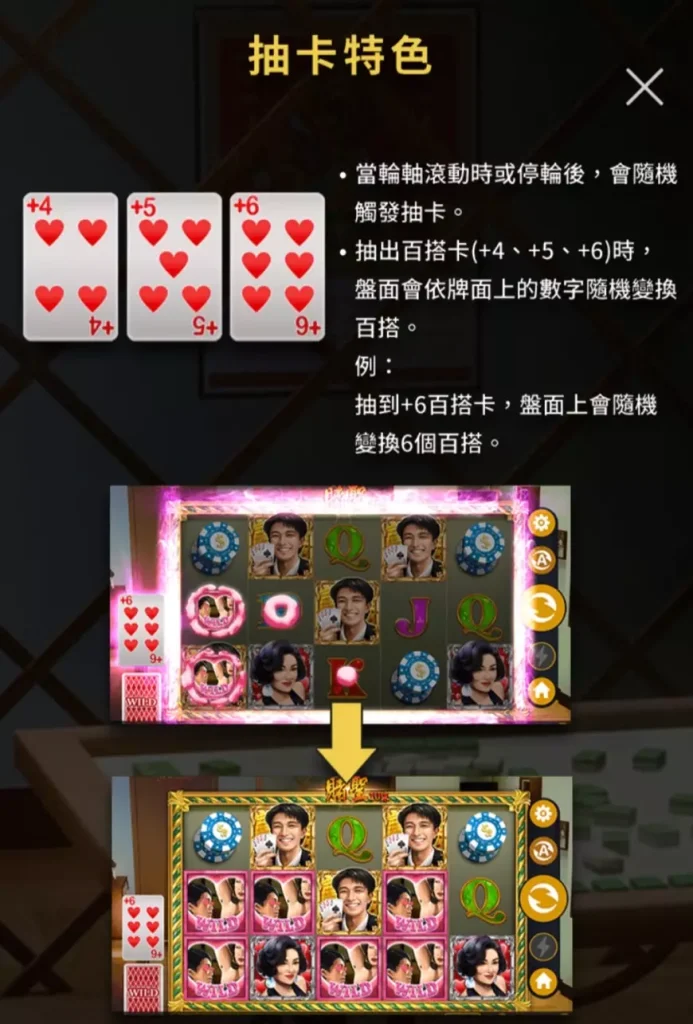 功能效果:當抽出百搭卡時,盤面將根據卡片數字隨機變換相應數量的百搭符號。抽到+6百搭卡,盤面上會隨機變換6個百搭符號,顯著提升中獎機率。