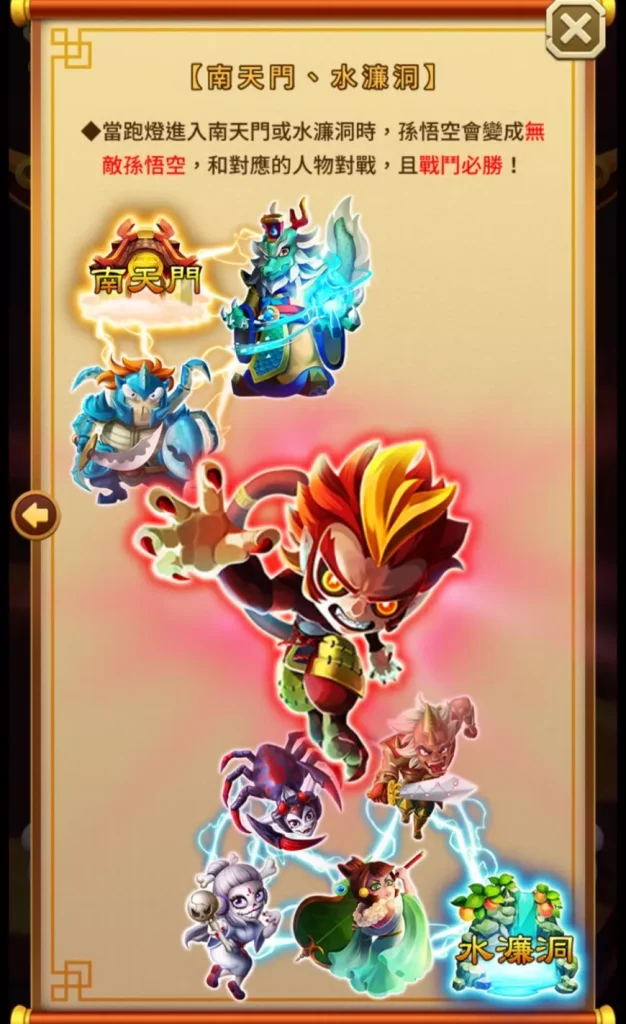 富88娛樂城這款遊戲中的特殊場景南天門和水濂洞增加了更多的遊戲深度與趣味性。當跑燈進入這些場景時,孫悟空將化身為無敵孫悟空,與對應的角色進行戰鬥,並且必勝無疑!這種設定讓玩家有機會在關鍵時刻獲得穩定的高額回報。