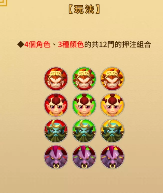 悟空傳》玩法以4個角色(孫悟空、紅孩兒、沙悟淨、牛魔王)和3種顏色(紅、綠、黃)的組合為核心,形成了12門押注選項,玩家可以根據自己的預測選擇押注。此外,遊戲還設有獨立獎項金龍和銀龍,其賠率範圍為36~199倍和24~99倍,提供了額外的高額回報機會。