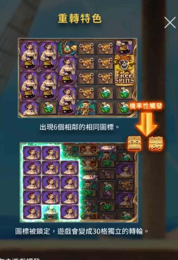 觸發重轉功能後,遊戲畫面將轉變為30格獨立的轉輪,而觸發重轉的主要圖標會被鎖定在轉輪上。接下來的每一次旋轉中,若再次出現相鄰的主要圖標,重轉將持續進行,直到不再有新的相鄰圖標出現為止。這一特色讓玩家能在單局遊戲中獲得多次旋轉的機會,並通過持續鎖定圖標組成更大的贏獎組合。