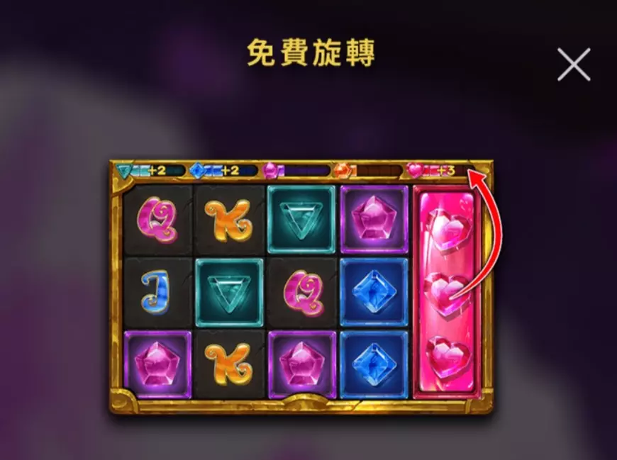 每個轉輪對應特定的寶石圖標,當該寶石填滿整個轉輪時,上方將累積倍數+1。免費旋轉結束後,所有轉輪累積的倍數將進行相加,為玩家帶來額外的獎金機會。