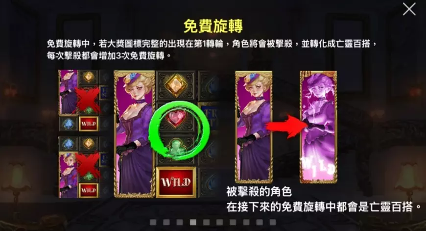 免費旋轉中,若大獎圖標完整出現在第1轉輪,角色將會被擊殺並轉化為亡靈百搭圖標。每次擊殺角色,不僅能將該角色轉化為亡靈百搭,還會額外增加3次免費旋轉。這些轉化為亡靈百搭的角色,會在接下來的免費旋轉中持續作為百搭圖標,進一步提升中獎概率。這一設計不僅延長了免費旋轉的時間,也增加了贏取大獎的機會。