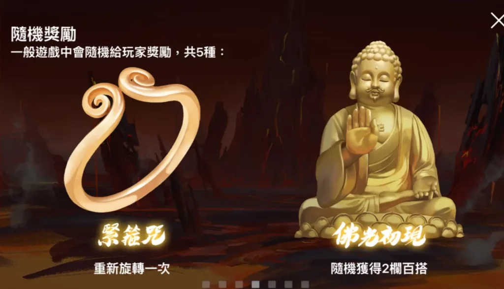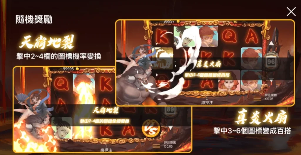 佛力初現則隨機為轉輪增加兩欄百搭符號,大幅提升中獎概率,為玩家創造更多的贏取連線的機會;天崩地裂只要擊中二至四欄的圖標,隨機轉換成其他符號組合,增加達成高額賠付的可能性。真炎火扇則是擊中三至六個圖標,將其轉換為百搭符號,形成高額獎金的可能性顯著增加。