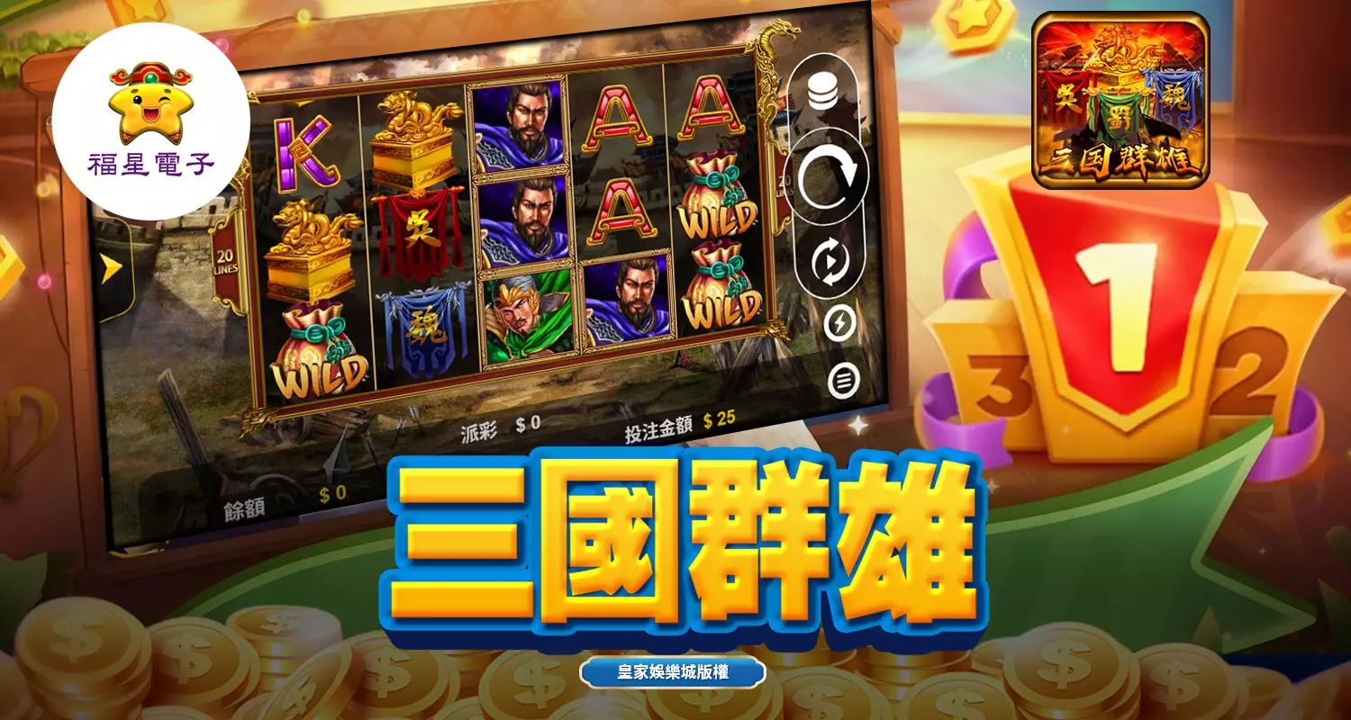 福星電子推出的《三國群雄》是一款以三國歷史為背景的3×5老虎機遊戲,擁有20條賠付線,以經典三國英雄為核心,結合了策略性與娛樂性,讓玩家在旋轉中重溫歷史的壯麗篇章。遊戲以獨特的設計、高回報的機制以及豐富的功能吸引了大量玩家。