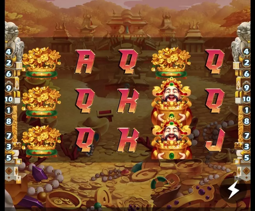 遊戲以中國傳統財神文化為主題,滾軸上的圖案包括金元寶、金幣、紅包和財神形象等,象徵著富貴與好運。整體畫面設計融合了鮮艷的紅色與金色,突出了財神遊戲的吉祥氣氛,讓人不禁期待財運降臨。