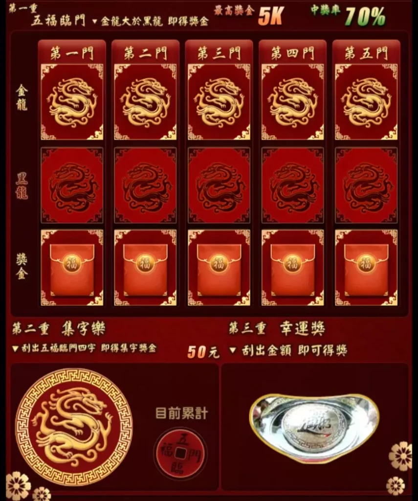 每張彩票有五道門,每一道門皆包含三個區域:金龍數字、黑龍數字、對應的獎金金額。當金龍數字大於黑龍數字時,玩家即可獲得該門的獎金。五道門的獎金可以累積,若多道門皆符合獲獎條件,最終累積彩金更驚人!