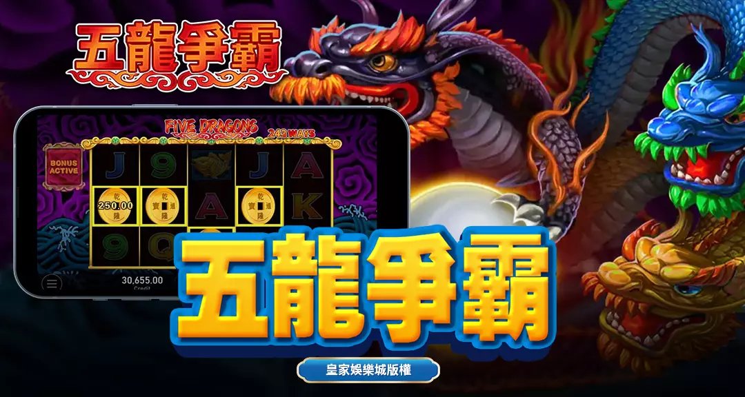 《五龍爭霸》以中國神話中五條龍的傳說作為創作靈感,紅龍、青龍、黃龍、白龍與黑龍各自代表不同的力量與財富能量。玩家的目標就是在五個轉輪之中集齊五龍符號,解鎖巨額獎金。從遊戲一開始,充滿東方色彩的背景配樂、金碧輝煌的圖騰設計以及炫目的龍紋動畫,即刻營造出氣勢磅礴的視覺震撼,彷彿置身古代帝王的龍殿之中。