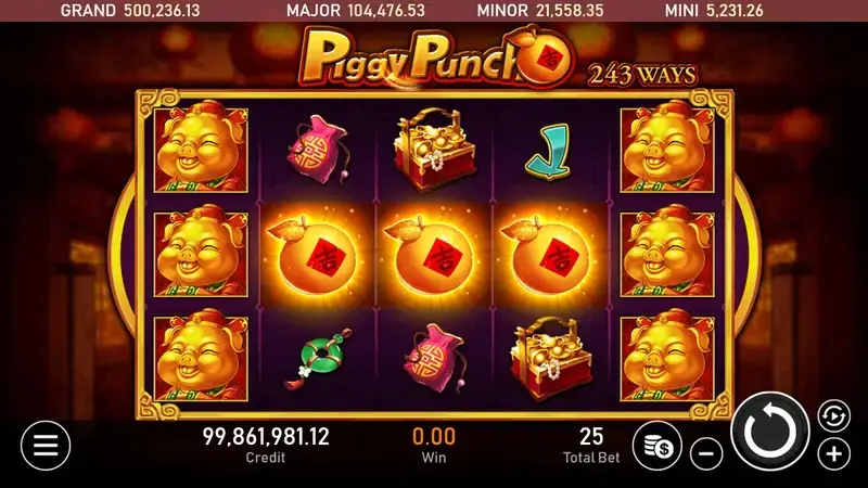 傳統老虎機通常採用固定的賠付線設計,但《金豬爆吉》跳脫框架,採用的是243種獲勝方式的玩法機制。這代表玩家只需從左至右,讓相同的圖案出現在相鄰的轉輪上,即可獲得獎勵。