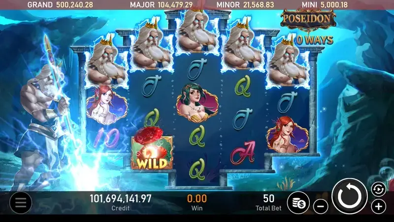 RSG電子海神也充分體現了老虎機的經典元素。遊戲中的百搭符號具備替代功能,能夠取代除分散符號以外的所有符號,幫助玩家形成更高倍數的中獎組合。特別的是,百搭符號僅會出現在第2、3、4轉軸上,並且當中獎時,賠付金額會乘以總下注數,讓玩家有機會在短時間內快速放大獎金。