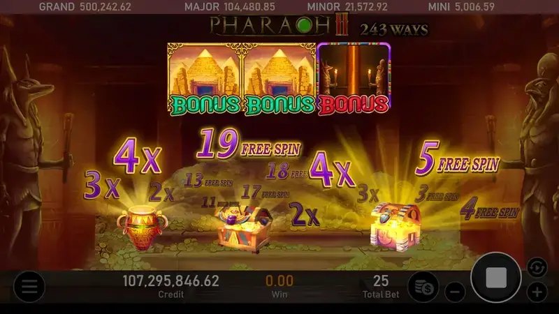 法老王II這款遊戲採用了3×5捲軸設計與243路賠付規則,搭配高達10300倍的最大中獎倍數與96.96%極高返還率,不僅擁有高頻連線的中獎機率,還提供了極具爆發力的彩金回報,是新手玩家與資深玩家都無法錯過的夢幻之選。