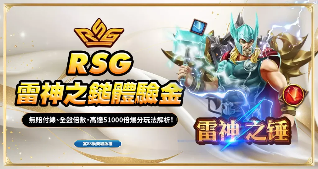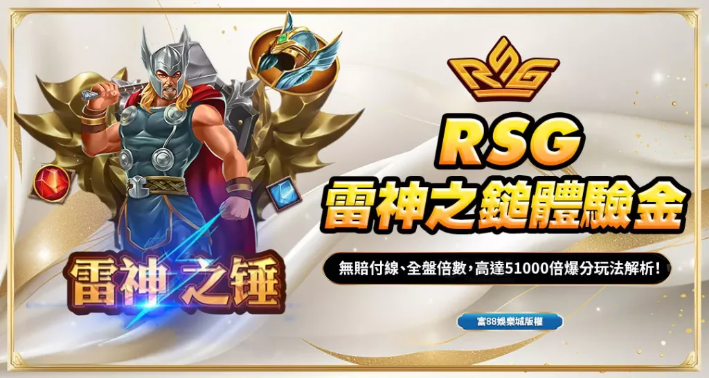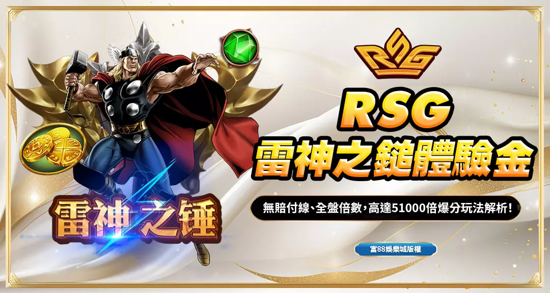 如果你正在找一個既能享受高品質遊戲,又能領到超佛心體驗金的娛樂平台,那麼富88娛樂城絕對是你最正確的選擇!尤其是對於超人氣遊戲《RSG雷神之鎚》的玩家來說,富88不僅提供雷神之鎚的完整試玩版本,還搭配超豐厚的體驗金活動,讓玩家可以完全零風險上手,輕鬆賺到第一桶金。