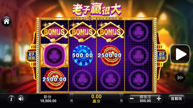玩家們都知道,玩老虎機最令人興奮的時刻,就是進入免費遊戲的瞬間,因為這意味著你贏錢的機會來了,而且贏錢的概率大大提高!在“老子贏很大”中,你將深深體會到什麼叫做贏得爽快、贏得痛快的感覺。每一次轉動都充滿了期待和驚喜,每一次中獎都讓你倍感滿足。