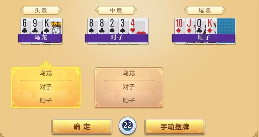 烏龍:一墩牌裡面都是一張張單獨的牌,沒牌型。獲勝贏1水。
