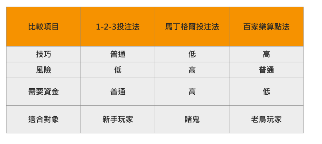 倍注法:每次輸局後加倍下注,但這需要在設定好止損點後進行,否則風險會非常高。