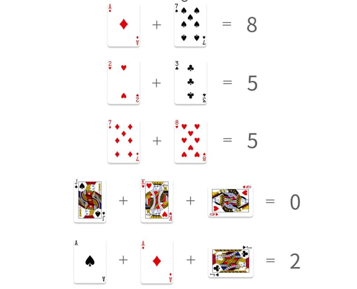 我們以一局百家樂遊戲為例來說明這種數值換算方式的實際操作過程。假設在某一局中,莊家與閒家的牌分別如下: