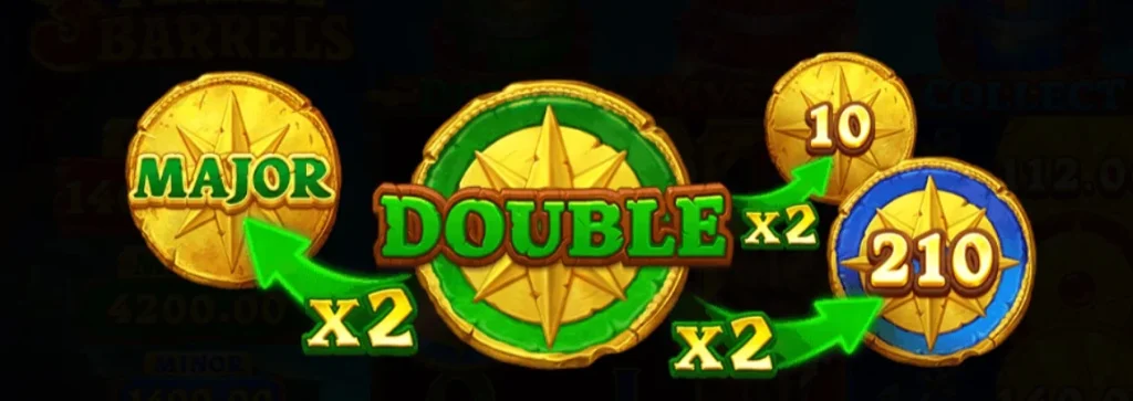 木桶功能是3海盜秘寶集鴻運的一大特色,帶來了更多的趣味和高額回報。在主遊戲或免費旋轉期間,每當海盜幣出現在卷軸上,都有機會觸發帶有木桶功能的獎金遊戲。在這個功能中,海盜幣不僅可以翻倍所有獎金圖案的價值,還會在獎金圖案價值相乘後,再次隨機給予1倍到150倍的總賭注獎勵。