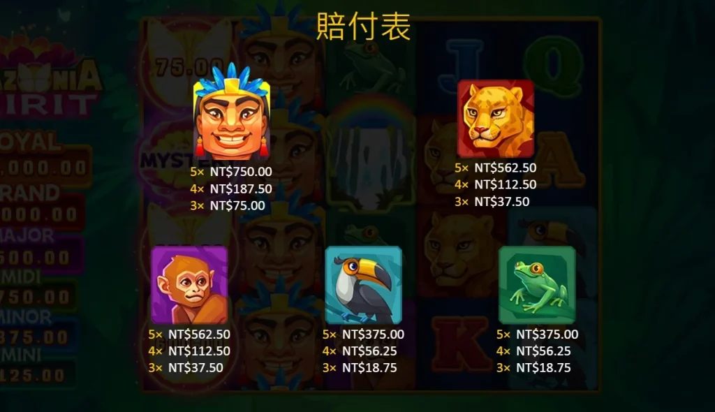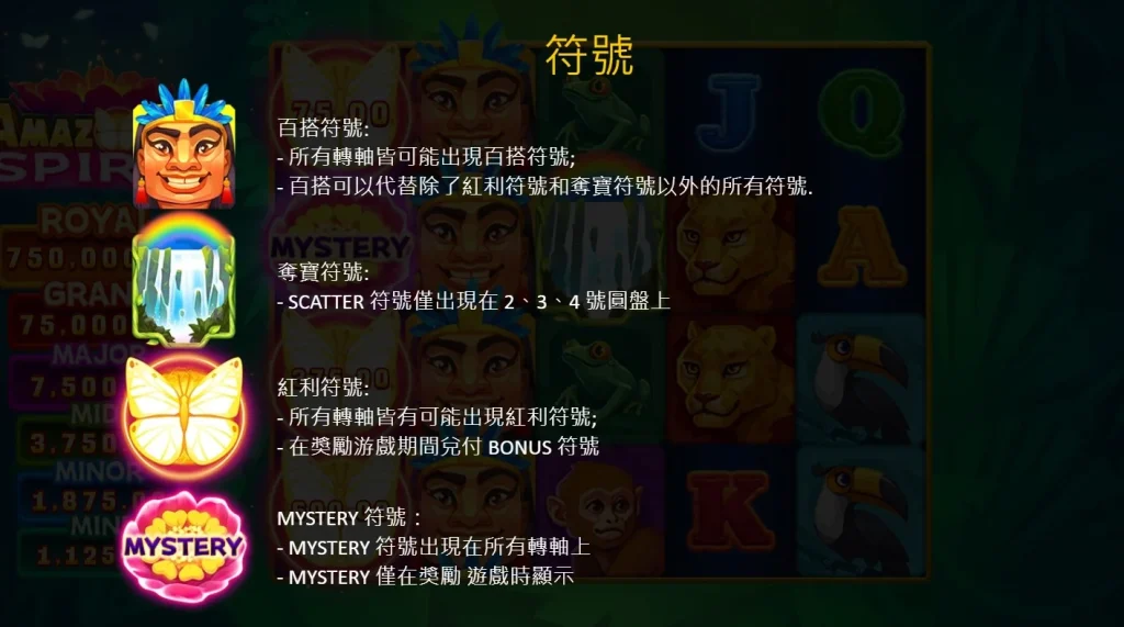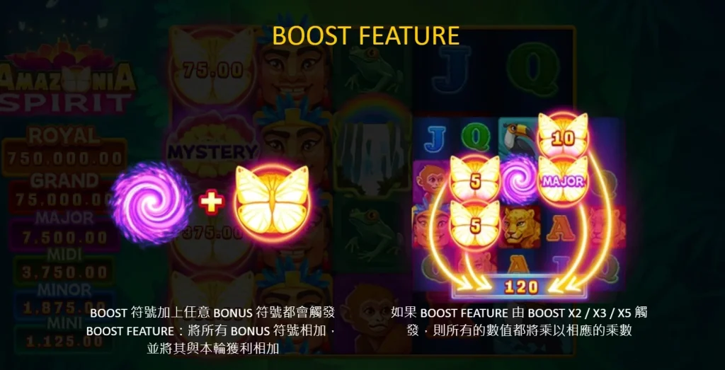 小編覺得這個遊戲最特別的在於,亞馬遜歷險集鴻運還設計了神秘符號(Mystery),這些符號只會在獎勵遊戲期間出現,每當它們被揭開時,都可能轉化成不同級別的獎金符號,包括MINI、MINOR、MIDI、MAJOR,甚至是獎金符號,每一個都代表著一次贏取大獎的機會。而且,當你在獎勵遊戲中觸發BOOST符號時,遊戲的刺激程度將會直接拉滿,BOOST功能會將場上的所有紅利符號加總,再將結果與本輪的獲利相加,如果是由BOOST X2/X3/X5觸發,還會進一步乘上相應的倍數,讓你的獎金數字瞬間暴漲。
