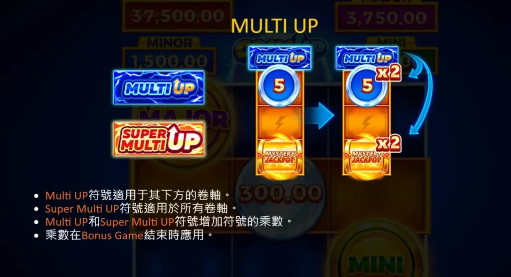 加上乘數機制的應用,每當乘數符號出現時,會為金幣和Jackpot獎金帶來額外的倍數加乘,進一步提升遊戲的回報潛力。