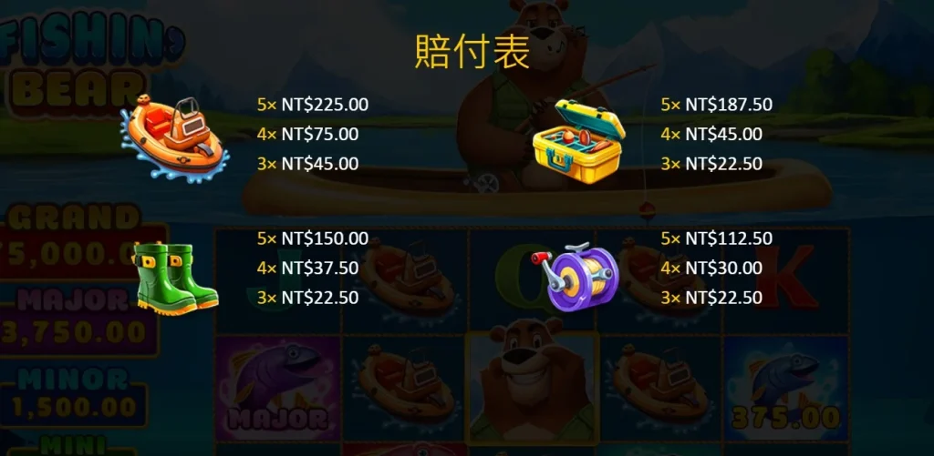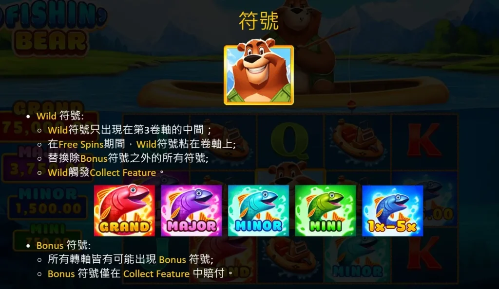 棕熊釣客的設計充滿了自然的氣息,主題圍繞著棕熊釣魚,背景是一片寧靜的湖泊,而卷軸上則充滿了各式與釣魚相關的符號。遊戲中最引人注目的,當然非Wild符號莫屬了!