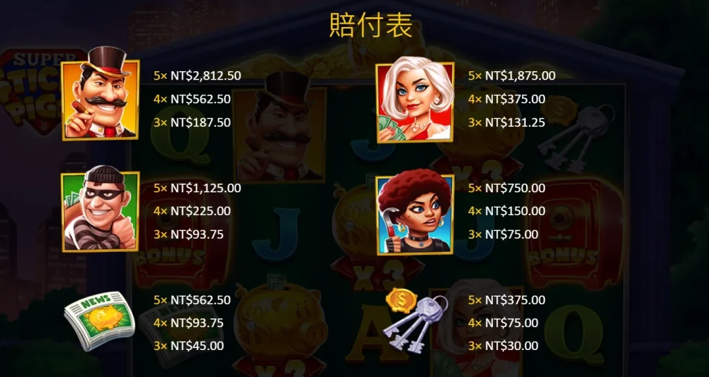 首先,超級豬寶大盜的最大亮點就在於它的特殊符號和高額賠付設計。在主遊戲中,只要出現3個或以上的Bonus符號,就能觸發免費旋轉,而這正是玩家通往大獎的起點!根據Bonus符號的數量不同,免費旋轉的次數也會有所變化:3個符號可以獲得9次以上免費旋轉,4個符號是12次以上,5個符號則能直接拿到15次以上的免費旋轉!小編可以告訴你,這些免費旋轉可是帶來大回報的關鍵!