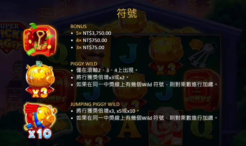 小豬百搭和Jumping小豬百搭是這款遊戲中的兩大特色符號,它們能大幅提升你的獎金倍數。小豬百搭符號出現在第2、第3、第4個轉軸上,可以將該行的獎金倍增至2倍或3倍,而如果同一條中獎線上有多個Wild符號,倍數還能累加!至於Jumping小豬百搭則更為強大,它能帶來3倍、5倍甚至10倍的倍數,同樣也可以累加!這些倍數的累加效果,讓你有機會在一輪旋轉中收穫驚人的大獎。
