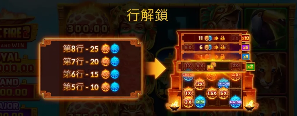 小編認為Bonus的魅力不僅僅在於不斷增加的符號數量,還在於逐步解鎖的行數。從第5行到第8行,每當玩家收集到一定數量的Bonus符號時,這些行數就會逐一解鎖,同時還能獲得倍數加乘: