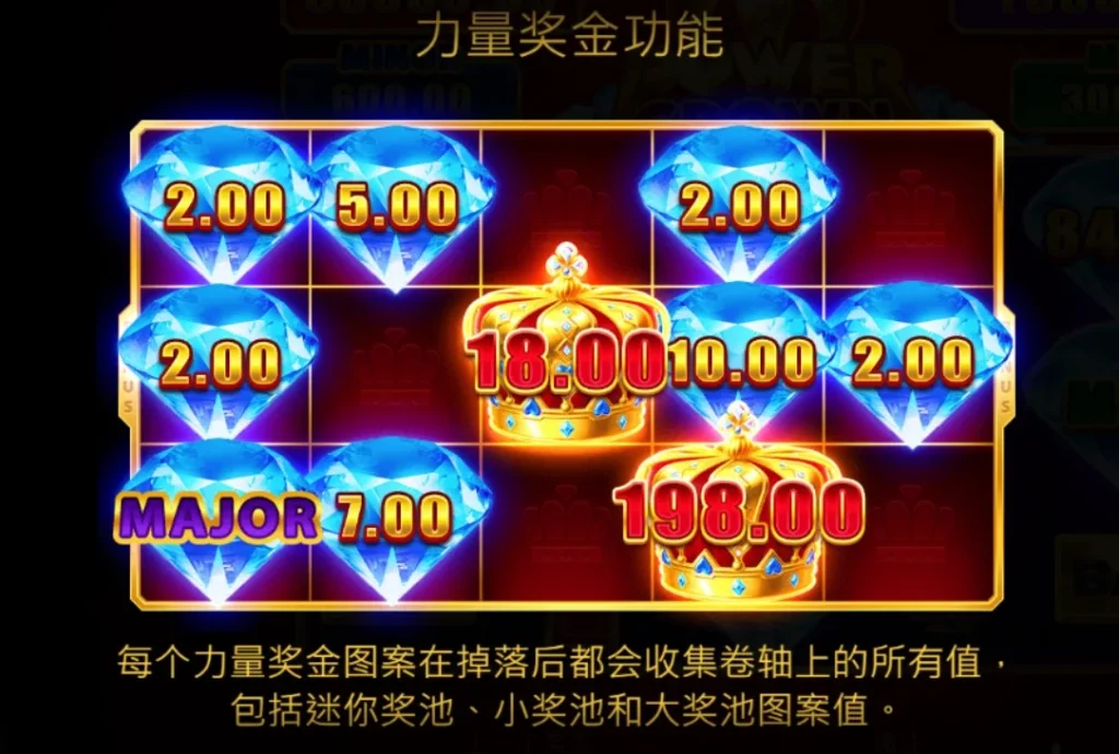 至尊皇冠的主打特色是獎金圖案與力量獎金圖案的結合。在主遊戲中,只要有6個以上的獎金圖案出現,或者它們與力量獎金圖案組合,就可以觸發獎金遊戲。一旦進入獎金遊戲,畫面將進一步簡化,僅留下這兩種類型的圖案,讓玩家專注於追逐高額回報。