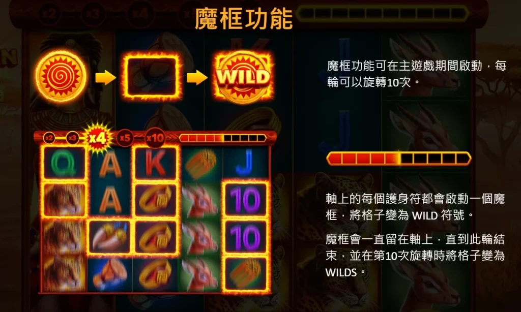 遊戲最大的特色是它的魔框功能,這個機制將整個遊戲推向了另一個層次。每次主遊戲都包括10次旋轉,而魔框的作用會在這期間逐步展現。在每次旋轉中,如果護身符落在軸上,對應的格子就會被魔框鎖定,直到這10次旋轉的最後一輪,所有魔框內的格子都將變為WILD符號。