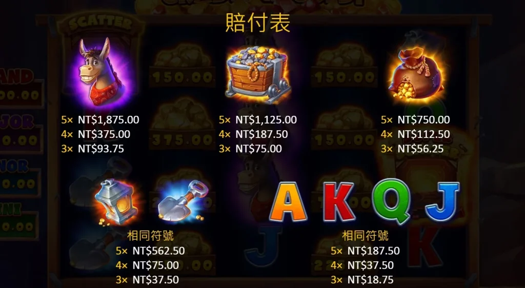 這款遊戲的設計充滿了探險的元素,彷彿讓玩家化身為尋寶的礦工,進入金礦深處尋找無盡的寶藏。遊戲的畫面採用了細緻的礦坑場景,配上閃亮的金幣和各種寶石符號,每次旋轉都為玩家營造出沉浸式的體驗。