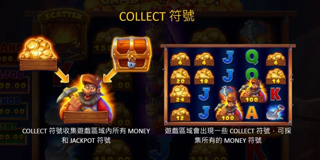 COLLECT符號是這款遊戲的另一個超重要的符號,它的功能在於收集遊戲區域內的所有MONEY和JACKPOT符號,並將這些數值匯總計算為當前旋轉的總獎金。在Free Spins模式下,COLLECT符號還會累積到進度列中,當進度達到新的級別時,玩家將獲得額外的+10次Free Spins,以及COLLECT符號的倍數增加,進一步提升玩家的收益。
