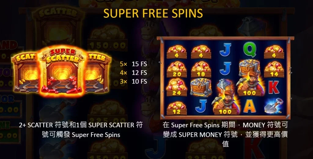 超級免費旋轉模式是這款遊戲的一大亮點。在此模式下,MONEY符號可以升級為SUPER MONEY符號,並獲得更高價值的回報。此外,遊戲還加入了隨機重轉機制,當遊戲區域僅有COLLECT符號但沒有MONEY符號時,隨機數量的MONEY符號將出現,增加獲勝的機會;反之,當只有MONEY符號時,也會進行隨機重轉以掉落COLLECT符號,確保玩家有足夠的符號來組成獎金組合。