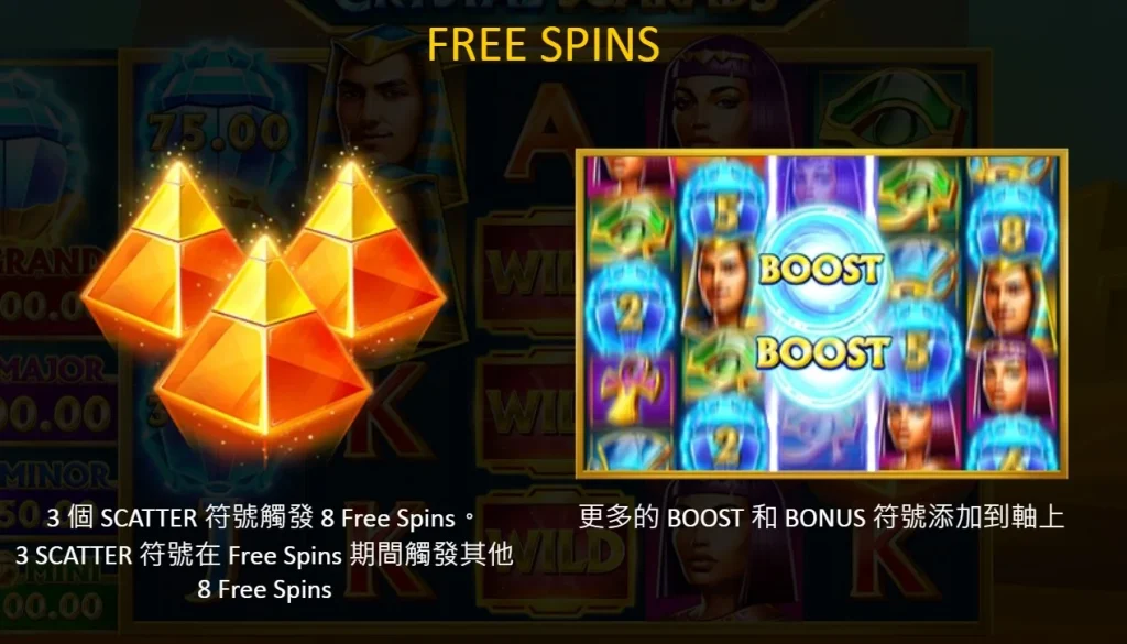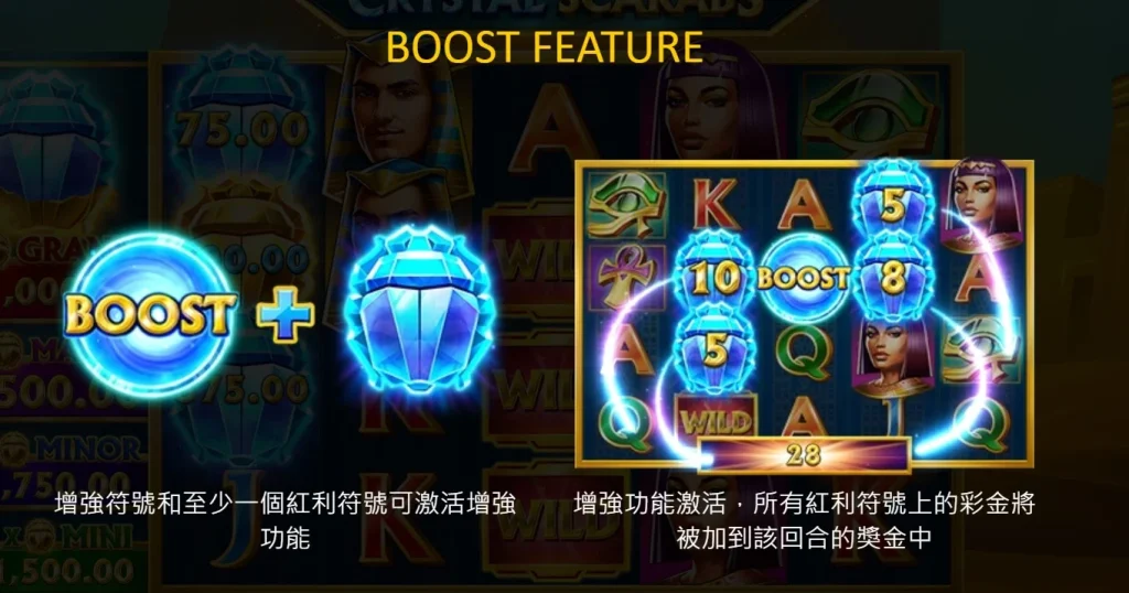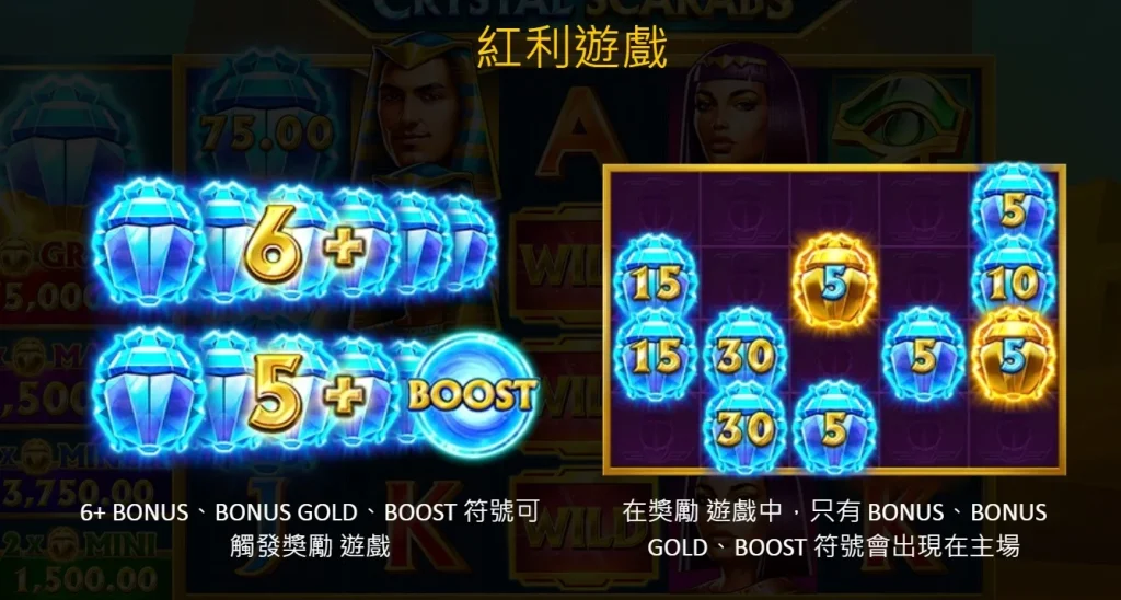 當你觸發紅利遊戲時,水晶聖甲蟲的玩法將迎來全新高度。在紅利遊戲中,主場僅會出現BONUS、BONUS和BOOST符號,而頂層水平線則為遊戲增添了更多變化。