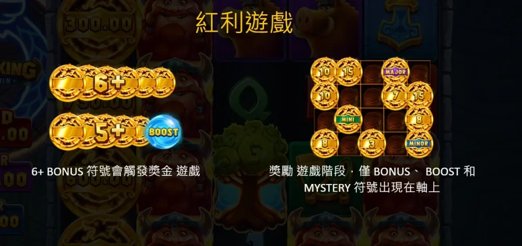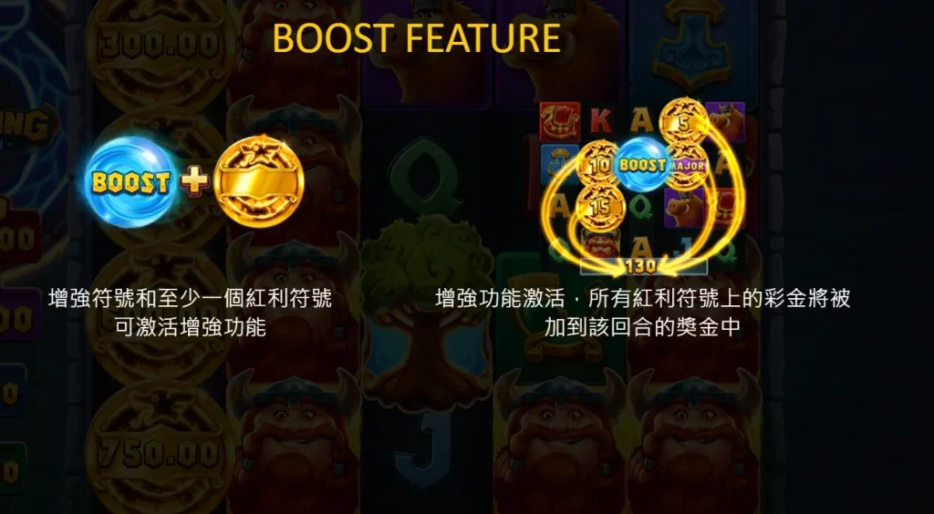 當遊戲中出現增強符號搭配紅利符號時,即可觸發增強功能。這項功能會將紅利符號上的彩金直接加到該回合的總獎金中,為你的收益加碼。此外,紅利符號在紅利遊戲和Boost Feature階段都能發揮作用,讓你的遊戲過程更加豐富多彩。
