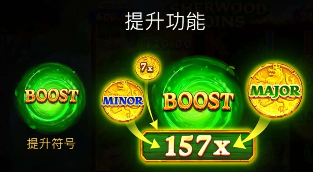 提升符號是俠盜羅賓漢遊戲中的一大亮點,與獎金符號結合後,將觸發強大的提升功能,將所有獎金符號的值相加並直接添加到旋轉獲益中。而且主遊戲和免費旋轉期間,提升符號僅會出現在第3個轉軸上。