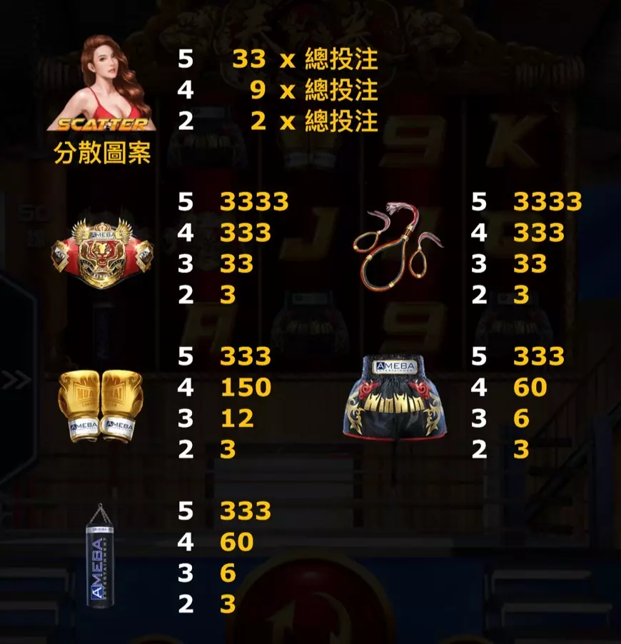AMEBA電子泰拳老虎機以泰國文化中的泰拳運動為靈感來源,遊戲畫面中充滿了代表性符號,如拳擊手套、泰拳短褲和泰拳選手等,這些符號不僅增添了遊戲的異國氛圍,還代表著高倍數的圖形。當玩家旋轉滾軸並形成連線時,這些高倍數圖形將為玩家帶來豐厚的獎金。