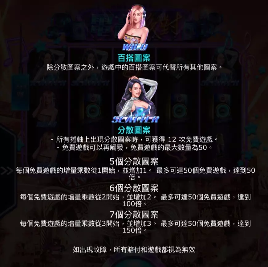 遊戲中的百搭符號由美女DJ擔任,她的身影不僅是遊戲中的亮點,也為玩家帶來了更多中獎的可能性。百搭符號可以替代遊戲中的任何圖形(免費符號除外),幫助玩家形成更多的連線組合,從而獲得更高的獎金。當百搭符號參與組合時,還會附加更多倍數的獎勵,為每一次旋轉增添更多的期待。