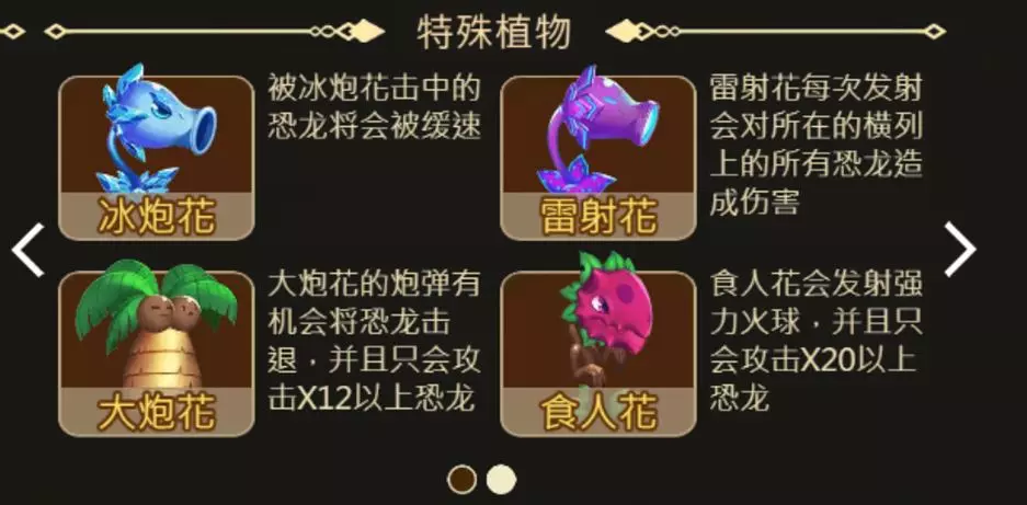 遊戲中的特殊植物則具備各種強大技能,針對不同恐龍提供獨特的戰鬥效果:
