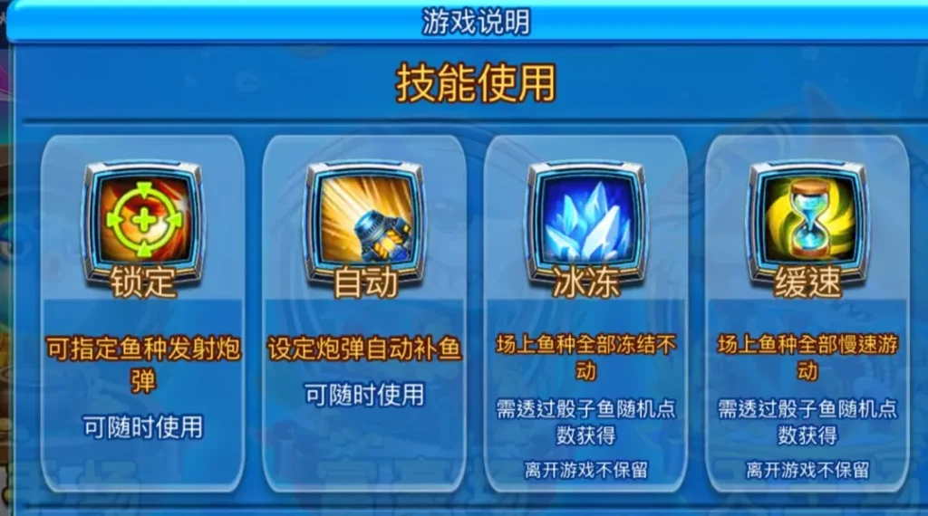 遊戲中的特殊技能更為捕魚體驗增添了策略性,例如冰凍技能可讓場上的所有魚群暫時凍結,便於玩家集中攻擊;而緩速技能則將魚群的移動速度減慢,提升了命中率。這些技能需通過捕獲紅利骰子魚來隨機獲得,但需注意的是,這些技能無法在玩家離開遊戲後保留,需在當局內使用。