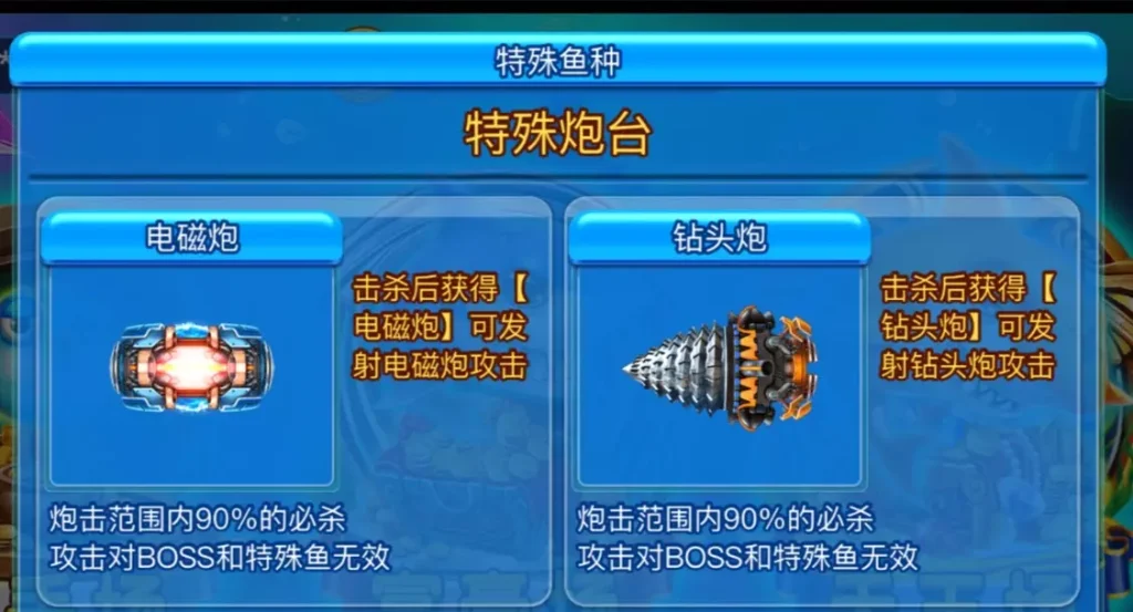 特別是稀有BOSS魚的設計,如高倍率的金鯊魚,讓人充滿期待與挑戰。而電磁砲、鑽頭砲等特殊武器也為遊戲增添了更多的策略性與趣味性,進一步提升了遊戲的吸引力。