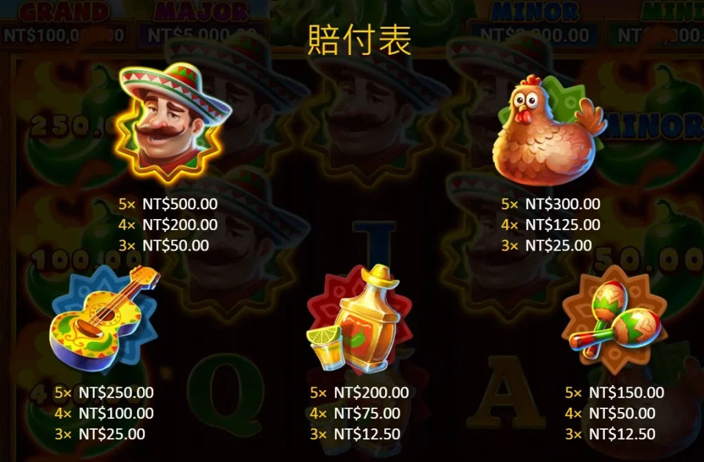 小辣嬌集鴻運老虎機是一款3×5軸的經典老虎機,共有20條賠付線,最低下注為3,最高可達2000。遊戲的主題結合了墨西哥文化元素,像是綠辣椒、火雞、美酒等,營造出濃濃的拉丁風情,非常適合喜歡豐富視覺體驗的玩家。遊戲還設有多層次的獎金機制,從MINI到GRAND的累積獎金層級,讓每位玩家都有機會挑戰高額回報。