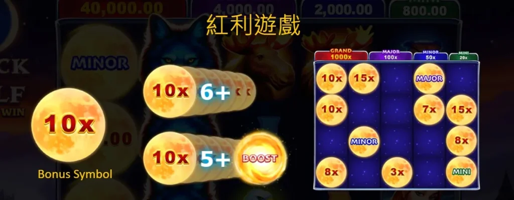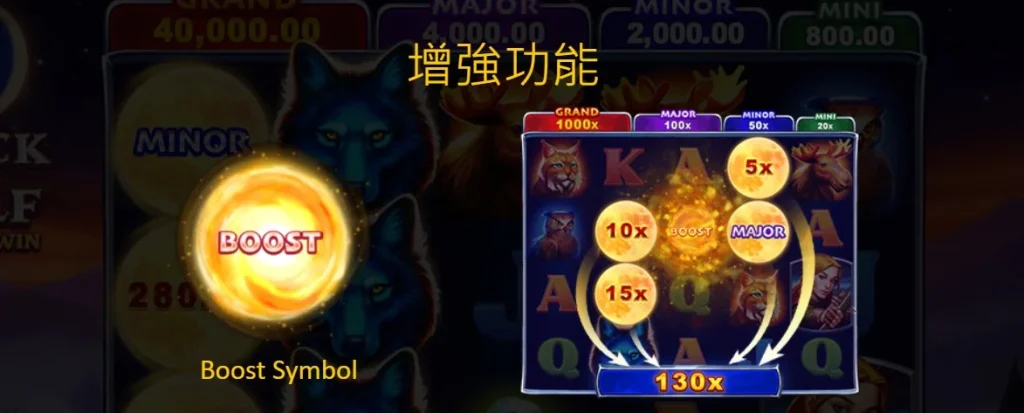 BOOST符號:主遊戲和免費遊戲中僅在第3軸出現,但在紅利遊戲中所有軸均可能出現,觸發後可累加BONUS符號上的彩金。