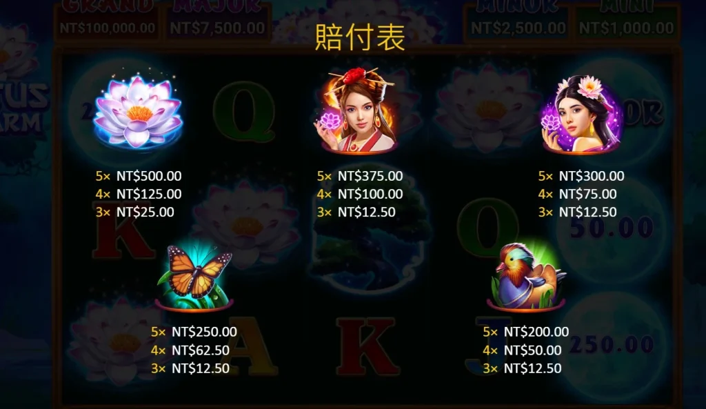 蓮花奇緣超百搭集鴻運是一款5×6軸的老虎機,擁有20條固定賠付線。遊戲背景設在一片寧靜的池塘中,象徵著祥和與豐收。玩家在旋轉時,可以看到蓮花、水晶球和散發神秘光芒的樹木等符號,這些設計充滿東方意境的美感,還有經典的A、K、Q、J牌面符號以精緻的風格呈現,讓整個畫面顯得既奢華又典雅。