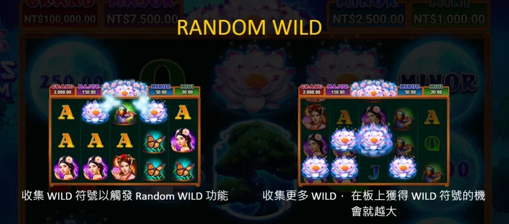 遊戲的特色之一是Random WILD功能,玩家在遊戲過程中收集WILD符號後,隨時都有機會觸發這項功能,隨機產生4至15個WILD符號,讓整個畫面充滿驚喜。這個功能不僅能在一般遊戲中觸發,也能在免費旋轉中出現,為玩家帶來更多機會。