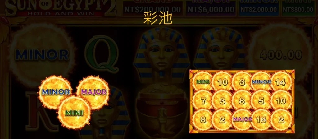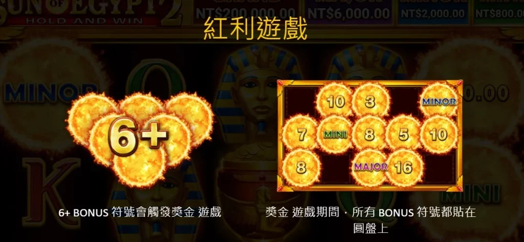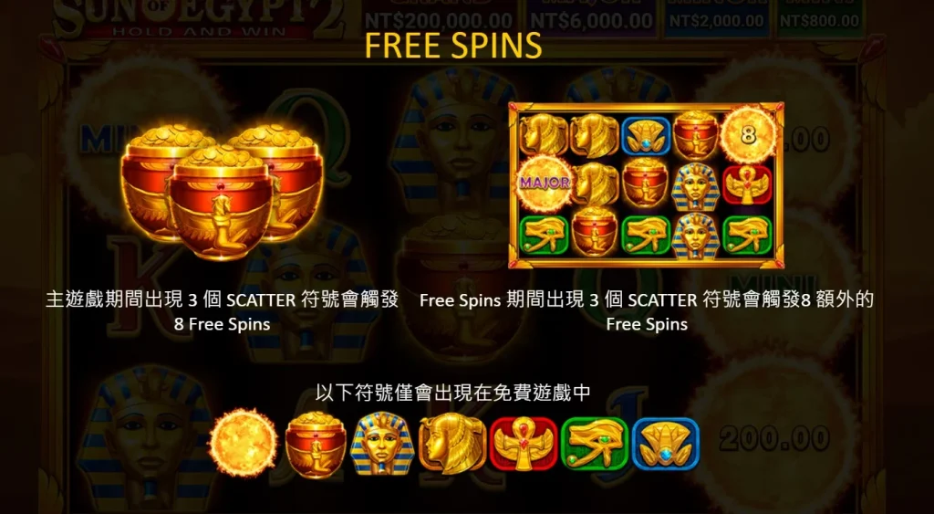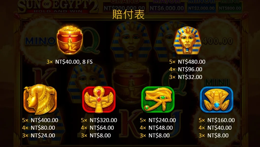 太陽神殿2集鴻運以古埃及的神秘背景為設計主題,金色沙漠的背景和神殿元素讓人感覺彷彿踏入一場尋寶冒險。遊戲中的圖案包括太陽、神祕符號,以及各種炫麗的古埃及符號,完美營造出濃厚的歷史文化氛圍。