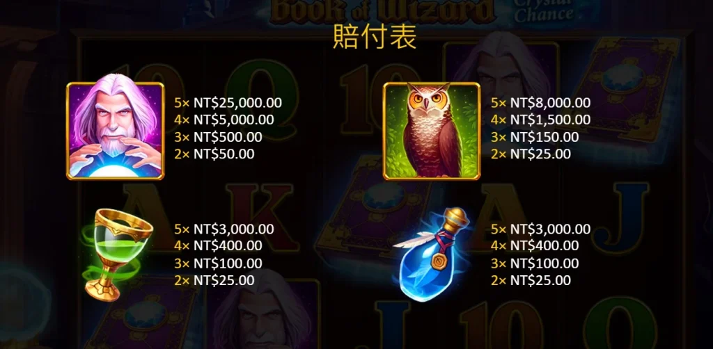 巫師之書水晶勝彩是一款以魔法為主題的3×5軸老虎機,擁有10條賠付線。遊戲背景設定在一個神秘的巫師書房,堆滿各式魔法道具和古書,搭配閃爍燈光,營造出充滿魔幻的氛圍。遊戲圖案包括魔法書、魔法師,以及傳統的A、K、Q、J和10,讓玩家每一次旋轉都像是在探索一段奇幻冒險。