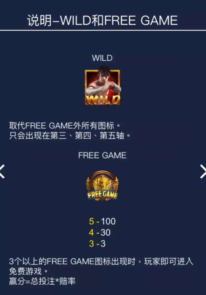 百搭符號是《拳力制霸》中的萬能符號,可以替代除免費遊戲符號外的所有符號,大幅提高玩家的中獎機率。需要注意的是,百搭符號僅會出現在第三、第四及第五卷軸,因此玩家在旋轉時要特別關注這三個卷軸。
